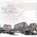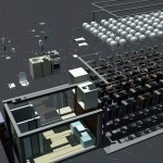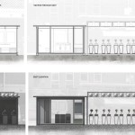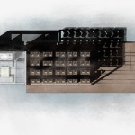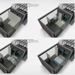 A railed base allows for interactivity and exploration of the gramophones. Above, units functioning on the principles of reverse inflation form a modular roof over the exhibit. The ‘rail’ notion continues inside the living unit. Variable use of the living space is achieved through interchangeable furniture on a ground and ceiling rail system.